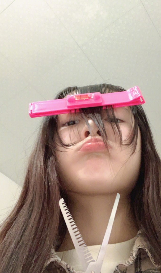 徐娇用粉色夹子夹住刘海,手里拿着剪刀俯视镜头嘟嘴卖萌,样子十分可爱。