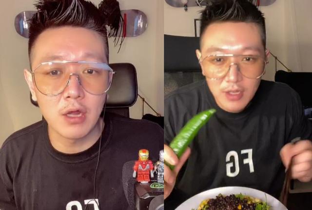 田源在直播中还做起了时下最流行的"吃播",不仅自己下厨做饭,做好后更是右手拿着辣椒直接开吃,毫不顾及形象。