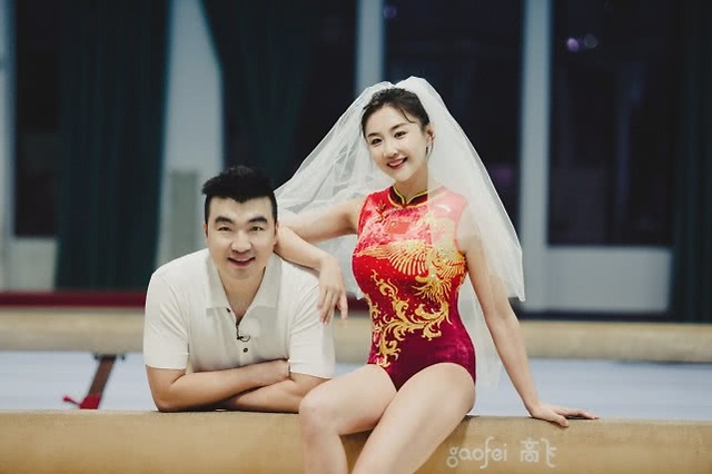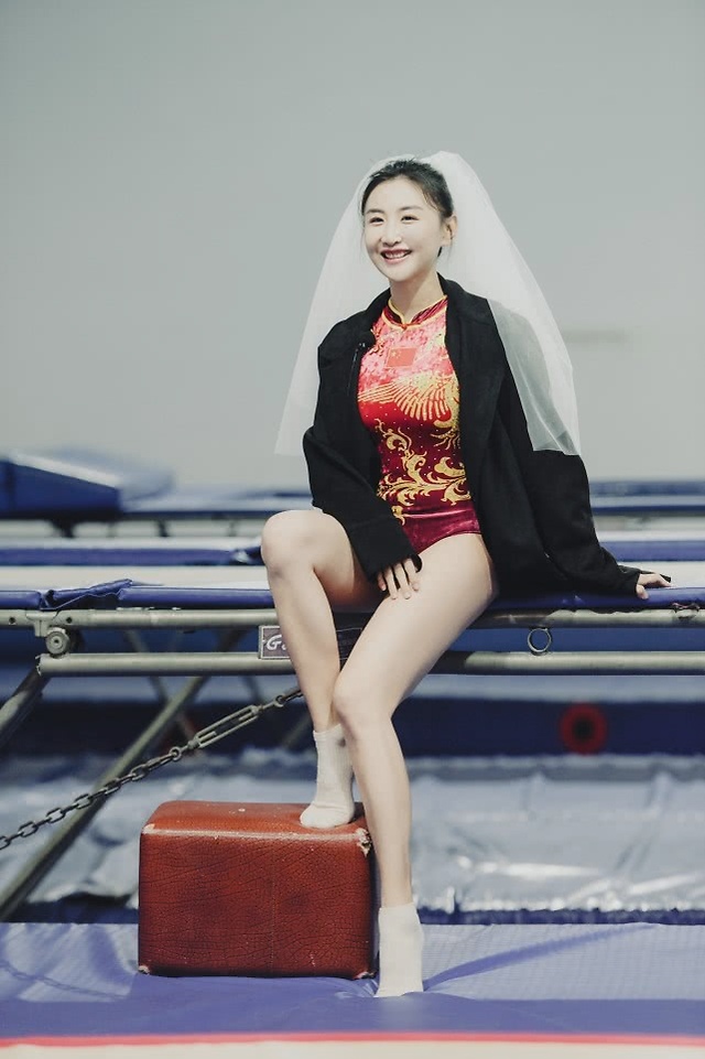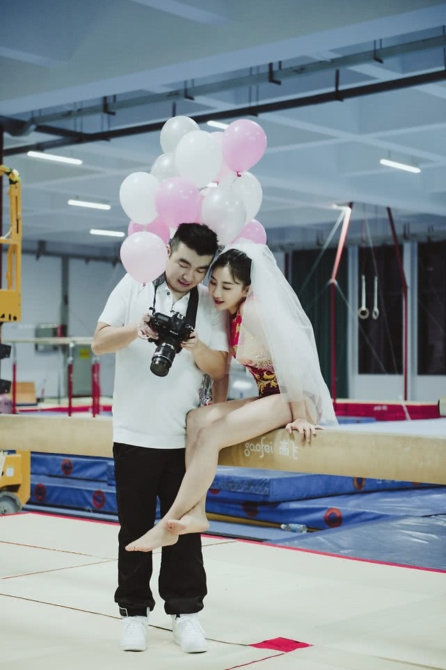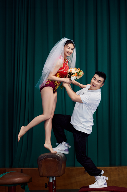 照片中,何雯娜身穿奥运体操服头戴白色头纱,回到旧日训练的体操馆拍摄婚纱照,何雯娜大长腿十分吸睛,梁超看向妻子的眼神里满是爱意。