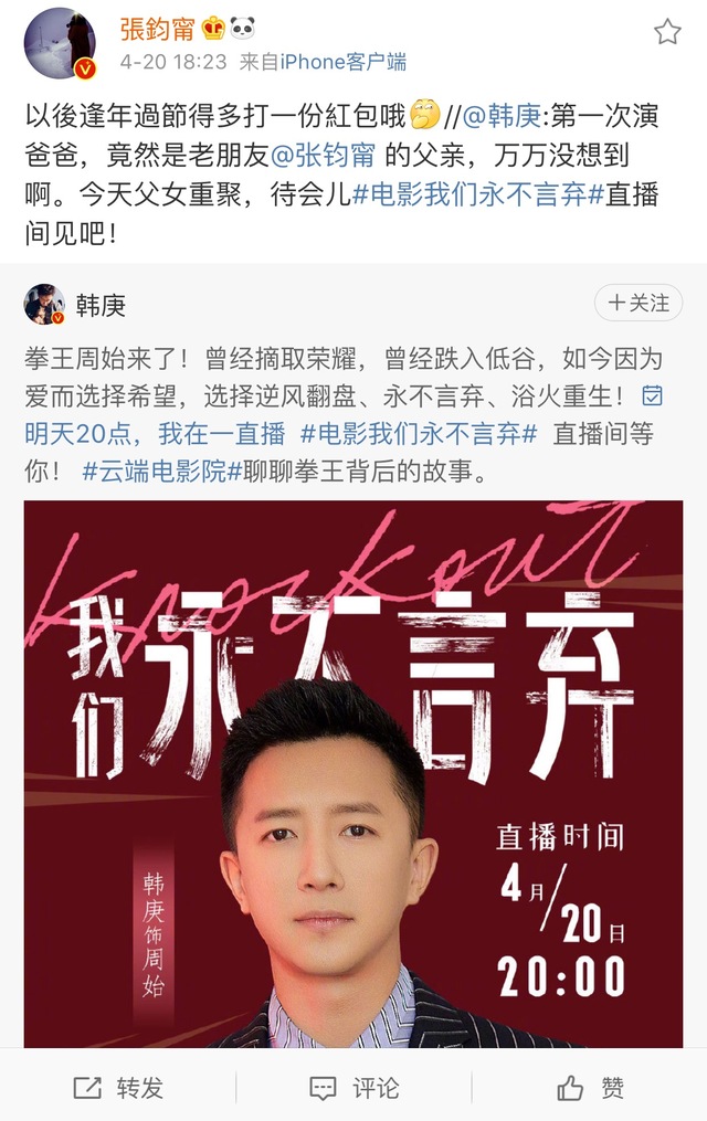 影片中,张钧甯饰演的成年周自在成功战胜病魔之后成为了一位著名作家,并将与父亲周始的之间的感人故事写成书与读者分享。昨日韩庚在社交平台上搞笑“认亲”张钧甯,发文道:“第一次演爸爸,竟然是老朋友张钧甯的父亲,万万没想到啊。”随后张钧甯转发互动:“以後逢年過節得多打一份紅包哦。”在当晚的影片线上直播活动中,张钧甯作为神秘嘉宾连线“父亲”韩庚,并直言拍戏是不是为了挣钱给“女儿”买好吃的呀?搞怪互动逗笑不少网友。更多精彩敬请关注电影《我们永不言弃》。