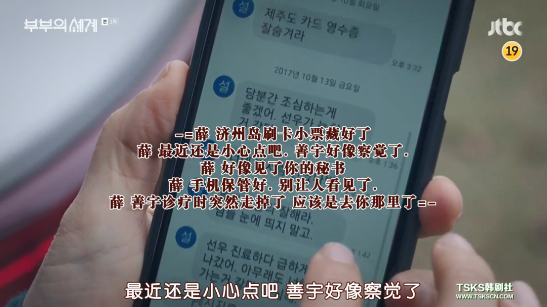 更令池善宇震惊和沉痛的是,手机中还有自己的好友们与丈夫和小三一同外出游玩的照片,以及自己的同事兼好友薛医生给李泰伍发的提醒池善宇发现他出轨了的短信。