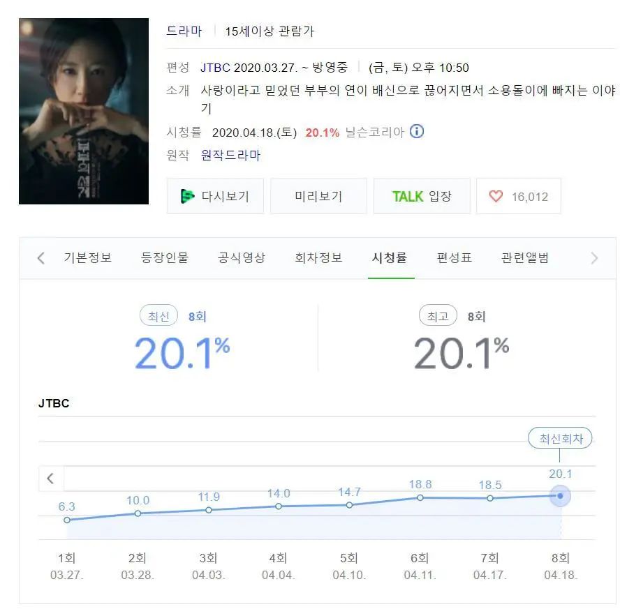现在到了《夫妻的世界》,金喜爱再次帮JTBC刷新了纪录。难怪有人说,金喜爱是JTBC的“福星”。而凭借《夫妻的世界》的成功,金喜爱也基本锁定了百想艺术大赏的一个视后提名。