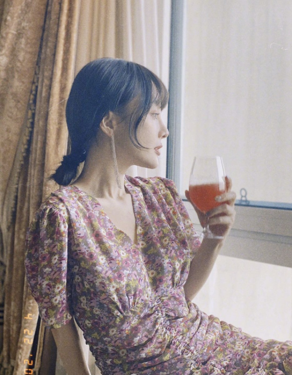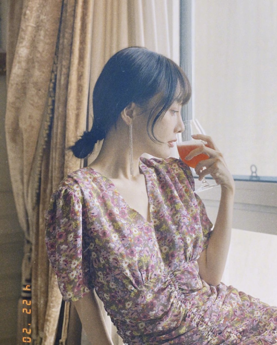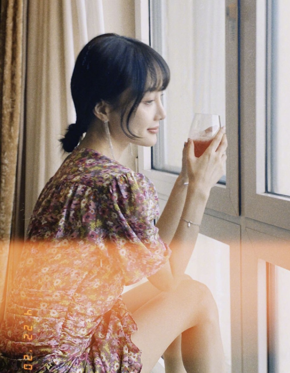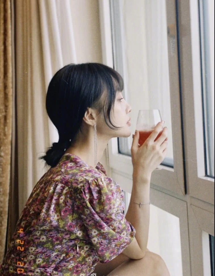 李小璐穿着碎花裙端果汁看向窗外