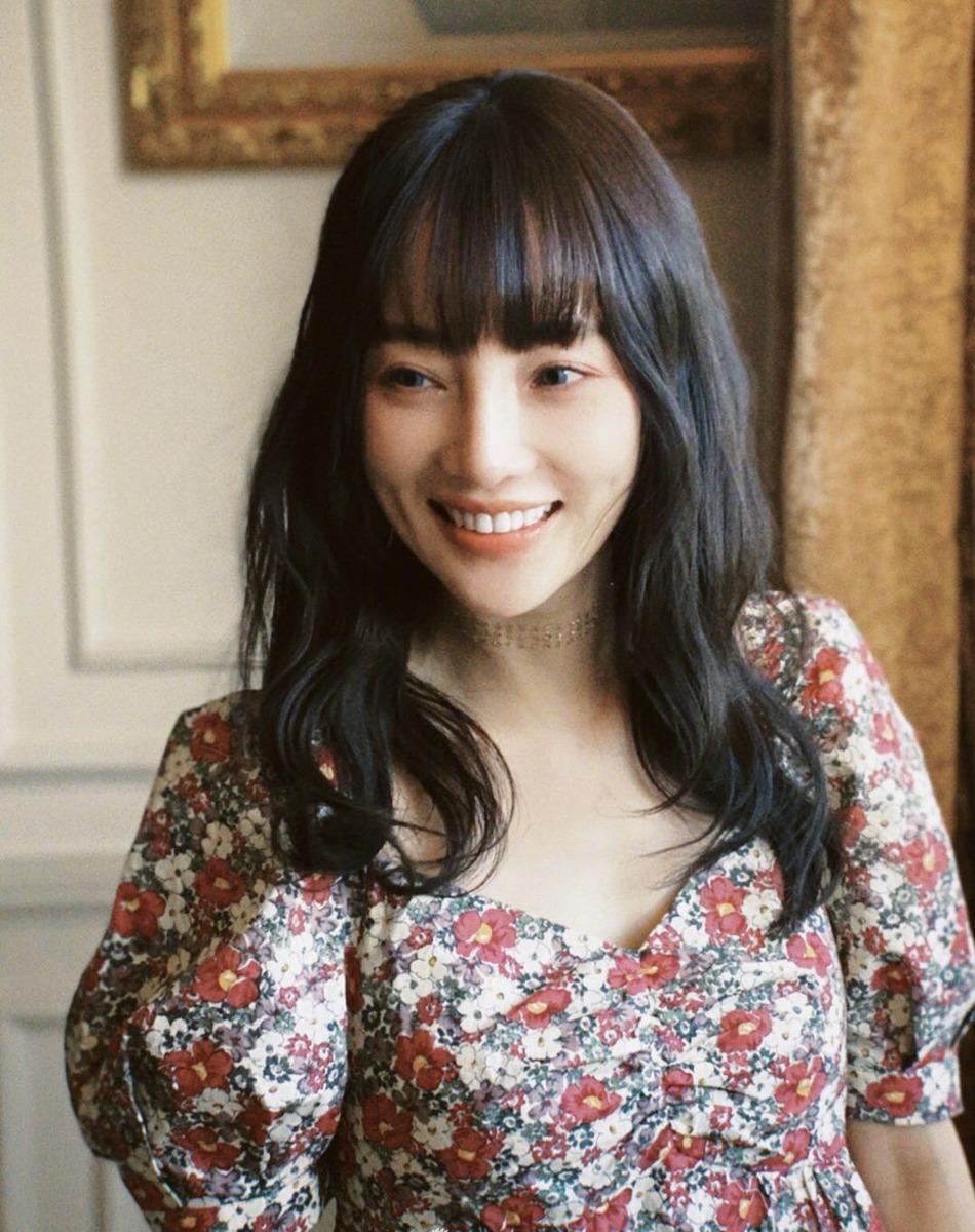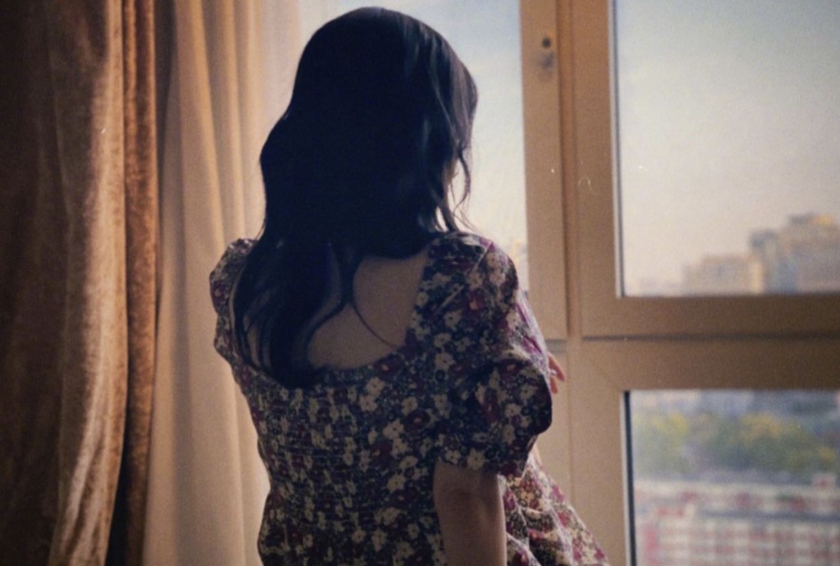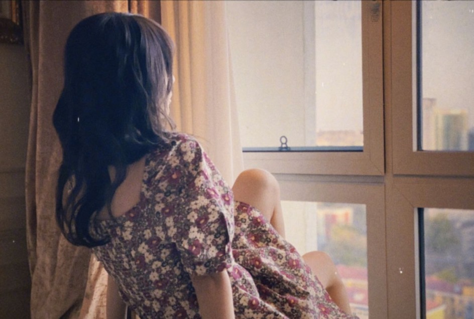 李小璐穿碎花裙窗前。