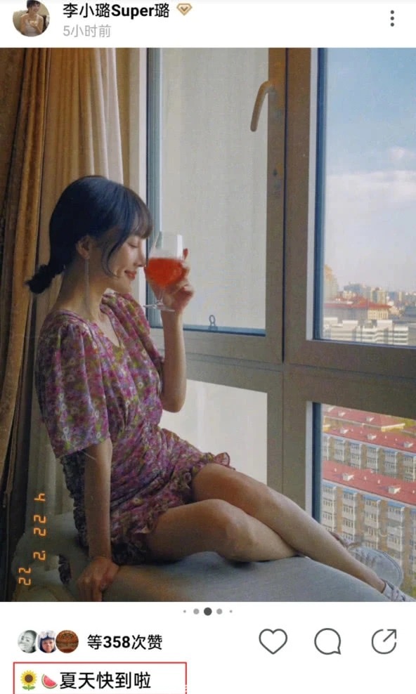 4月23日凌晨,李小璐在社交平台晒出一组清新美照,并配文“夏天快到啦”。李小璐身穿碎花裙,手里拿着西瓜汁,在窗前凹造型,甜美的模样完全看不出已经38
