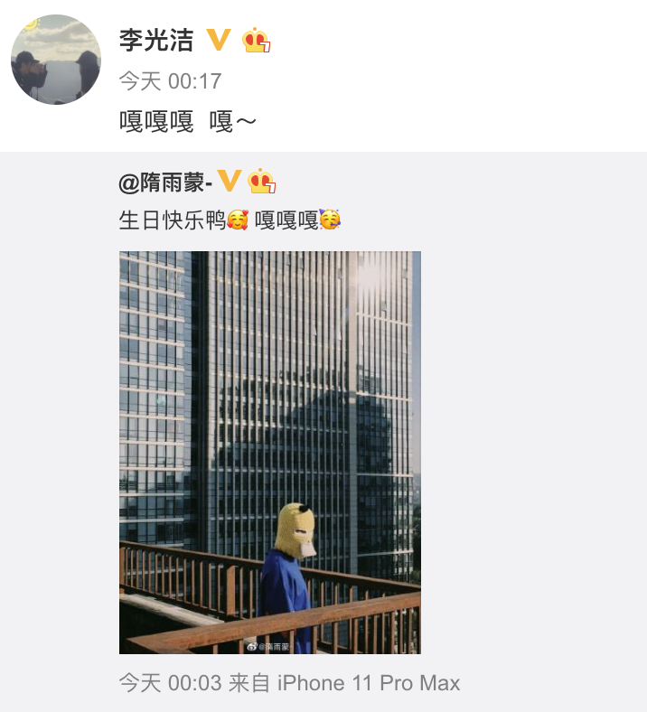 4月23日是李光洁的39岁生日。零点刚过,李光洁的妻子隋雨蒙便在微博晒出照片为其庆生,并配文道:“生日快乐鸭,嘎嘎嘎”。随后,李光洁也转发微博,并写道“嘎嘎嘎 ,嘎~”甜蜜又有爱。照片中的人戴着毛线鸭子头套,身穿蓝色卫衣,置身高楼之中,十分有意境。
