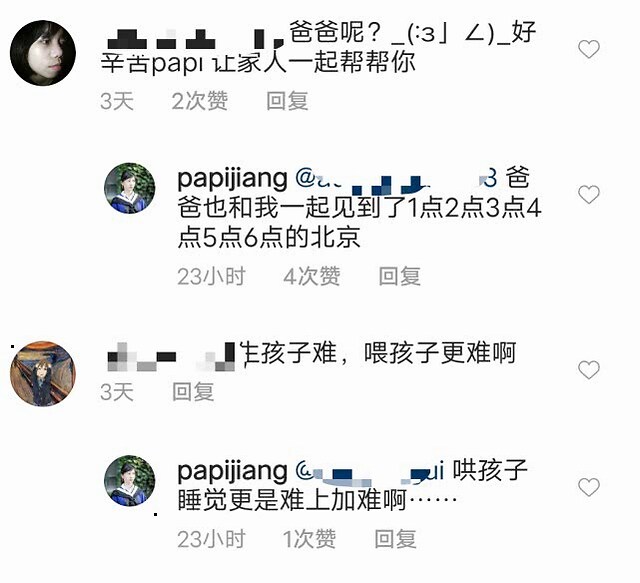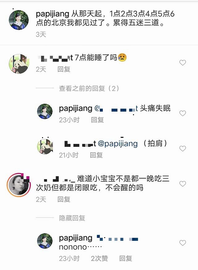 她还回复网友称,其丈夫老胡也跟着她一起半夜起来给孩子喂奶、哄孩子睡觉。即便宝宝终于酣然入睡了,她又经常因为头痛而继续失眠。