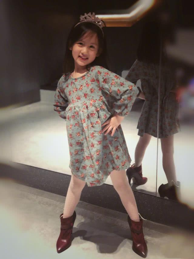 照片里的妹妹人儿穿着白色打底裤,搭配连衣裙,披散着长直发和斜刘海,戴着皇冠,穿着妈妈的高跟鞋,双手叉腰,气质超赞。