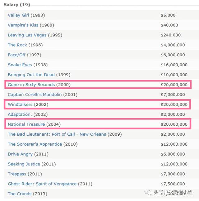 本世纪初期,他的片酬最高时跻身2000万美元/部的好莱坞顶级片酬俱乐部,包括《极速60秒》《风语者》《国家宝藏》都是这个水准,但10年之后,他的片酬就跌到了100万美元/部,风光不再。