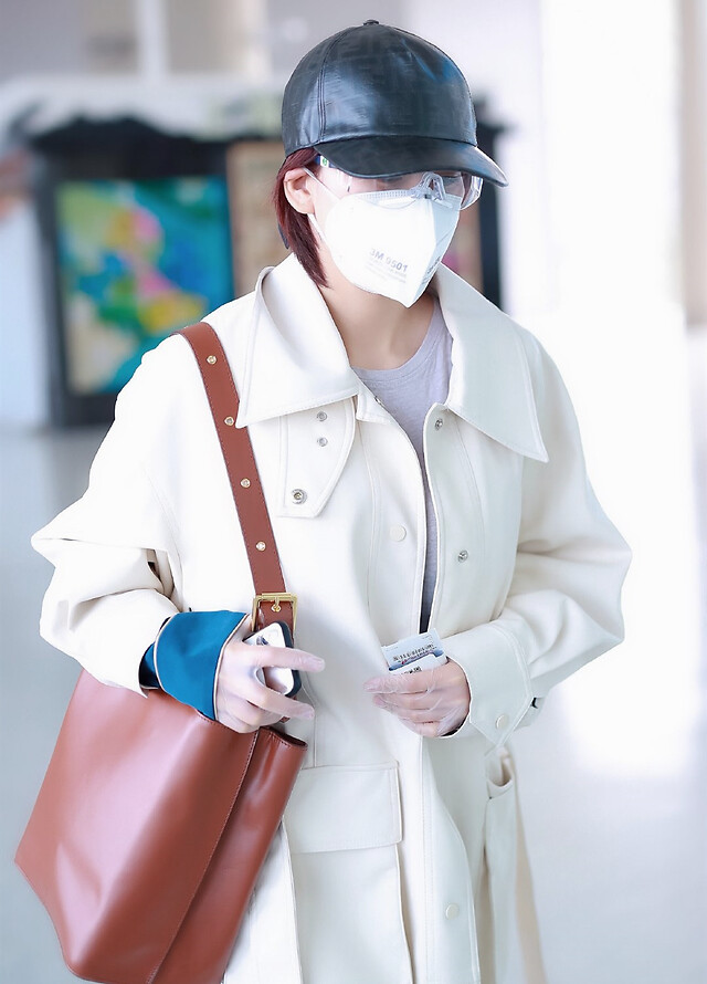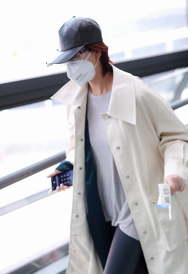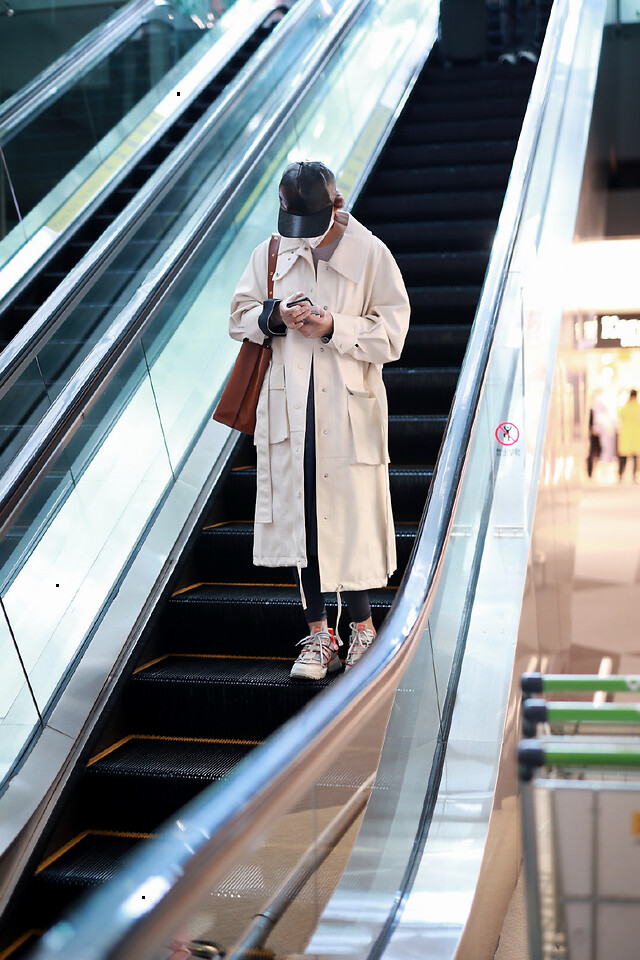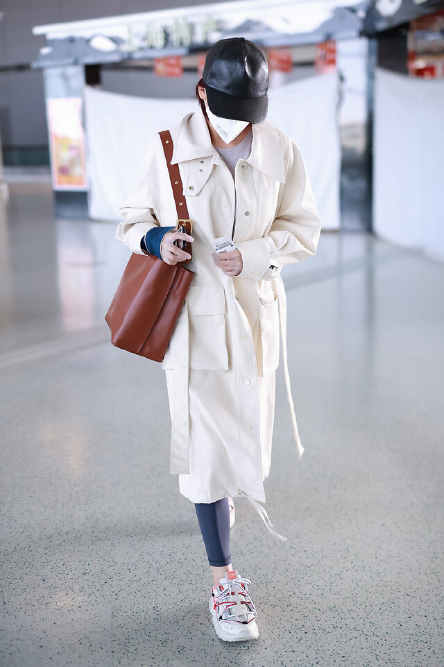 照片中的张馨予一件奶白色长款风衣外套搭配黑色棒球帽,护目镜、口罩、一次性手套把自己遮得严严实实,这一身装备把自己保护得很好了。