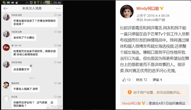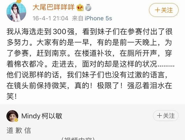 看到柯以敏道歉的文章发出来之后,不少曾经参加海选的妹子都纷纷转发,其中一位选手说:当时妹子们都很努力,却没想到会遭受这样的待遇,每个人都强忍着眼泪在笑。