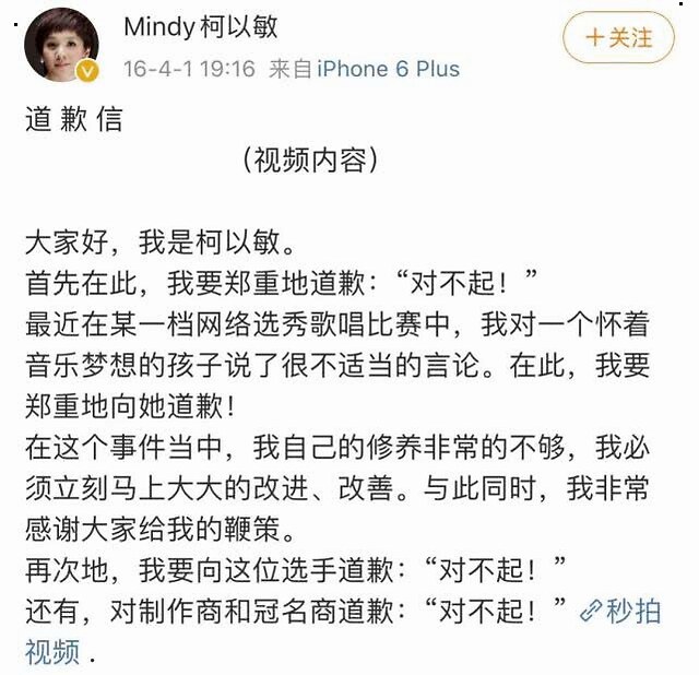 之后,柯以敏不在洗白而是选择了一种公众惯用的方式:道歉。