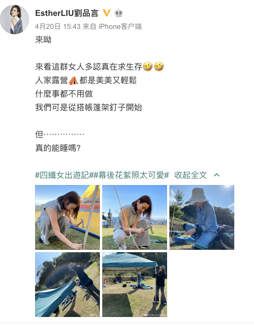 此前,刘品言曾在社交平台上晒出她们露营时搭帐篷的照片,并吐槽:“别人露营都是美美的,而她们却要自己搭帐篷”。