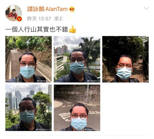 在晒出的照片中,谭咏麟梳着油头,满头黑发扎成了小辫子,背着双肩背包,即使戴着口罩也难以掩盖其散发出的魅力,根据配文:"一个人行山也不错"可以得知原来谭咏麟是去爬山了!