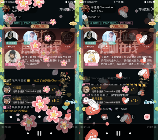 在《鬓边不是海棠红》中,佘诗曼饰演的二奶奶范湘儿泼辣豪爽获得了不少观众的喜爱。苏柏丽老师的配音更是让人物增色不少。而幽舞越山作为作为参配过电影《大护法》、《大黄蜂》、《哆啦A梦》、《樱桃小丸子》等多部作品的配音演员也被不少人所熟知。真身音魂连线直播让直播间网友欢乐不已,各类礼物和弹幕频繁刷屏。