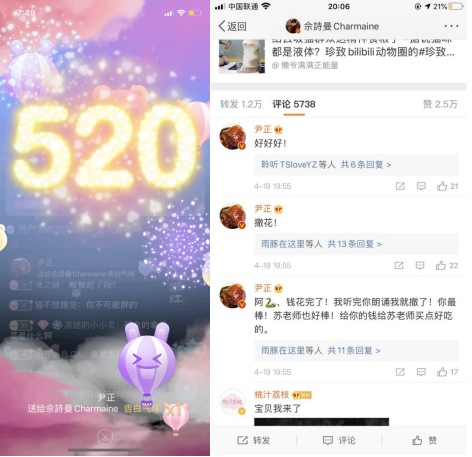 值得注意的是,尹正也在当晚现身直播间,送上了520大礼物为两位热情打投。在《鬓边不是海棠红》中,尹正饰演的商老板和阿佘饰演的二奶奶也有不少对手戏。商老板还在戏中称二奶奶为”财神奶奶“。网友看见商老板为二奶奶刷礼物告白便纷纷起哄:二奶奶终于见着回头钱了。在各种弹幕、礼物打投中,直播间氛围冲向高潮。最后,在依依不佘中结束。