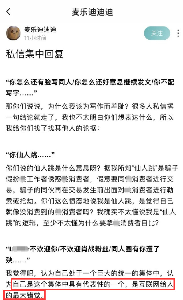 回答网友私信的最后麦乐迪还表示,写博君一肖同人文并不是羞耻的事情,每个人都有创作的自由:“对我来说,不能区分群体和个体的人;只会看身份预设立场而不能理解个体观点多样性的人;声称要维护言论自由创作自由却到处用脏话和没有逻辑的批评攻击他人的人,都令我厌恶至极。”