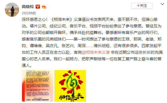 4月20日,新浪微博、网易云音乐、大麦网、虾米音乐四大平台联合宣布将发起《相信未来》线上义演活动。22日午后,总策划高晓松发长文表达了对参与人员的感谢。