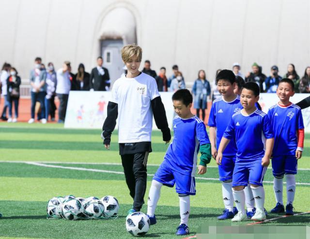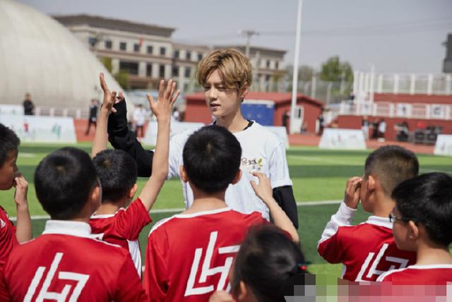 现场照片中,鹿晗留着一头黄色的头发,身穿黑色运动服,白色的T恤,身材高挑,步伐矫健,在偌大的球场上非常显眼。鹿晗一边走一边低头望着身边的孩子们,这一群金顶街第四小学的孩子们身穿鹿晗捐赠的爱心足球装备,眼神里充满了喜悦。