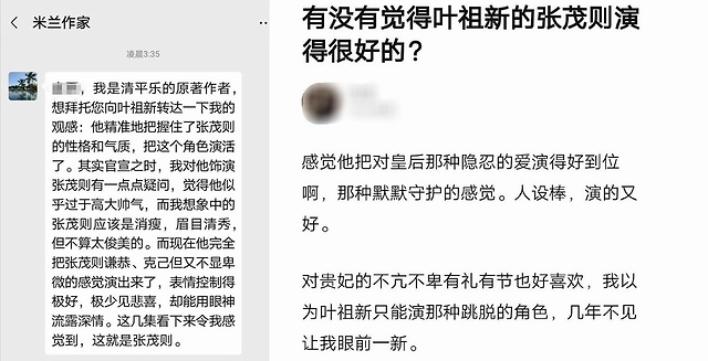 该剧无论是剧中精致考究的服装道具,还是演员细腻入微的精湛演技,都让观众深叹品质之作,沉迷这部古代传奇剧集的魅力。剧中, 张茂则在面对自己对皇后(江疏影 饰)的钦慕之情时,也能做到不露声色、紧守教条,对皇后隐忍克制的感情,则让张茂则这一人物更加鲜活立体。网友们纷纷评论:“感觉他的眼神很有戏,没想到他把对曹皇后的隐忍深情演的这么好”!更是得到了原著作者米兰lady的盛赞,她说:“叶祖新精准地把握住了张茂则这个人物的性格和气质,把这个角色演活了。并且完全把张茂则恭顺谦逊、克己但不显卑微的感觉演出来了,表情控制的极好,极少见悲喜,却能用眼神流露深情,这几集下来,令我觉得,这就是张茂则”。