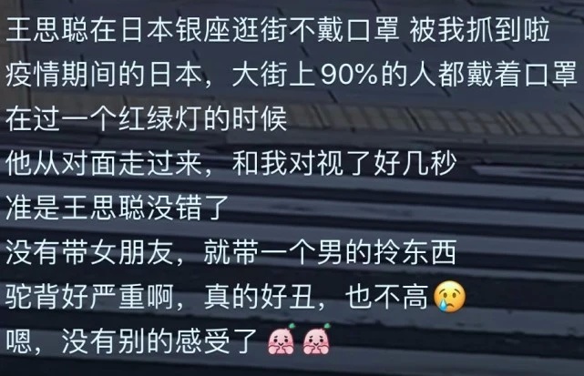 从网友说拍到的画面可见,路上行人都戴着口罩,王思聪走在人群中显得很突兀。