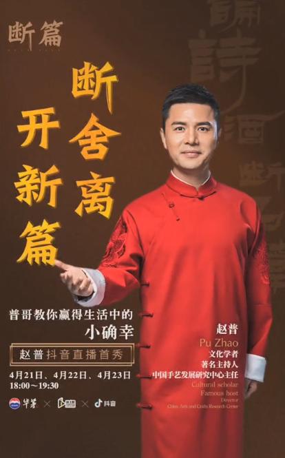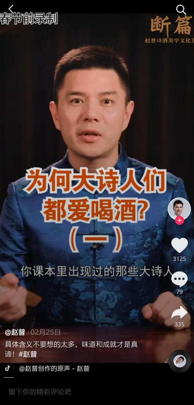 原来,赵普是为自己在某短视频平台进行的直播首秀做宣传。他曾在个人社交平台上传多个作品,以“断舍离”为主题为大家科普诗酒文化的小视频。