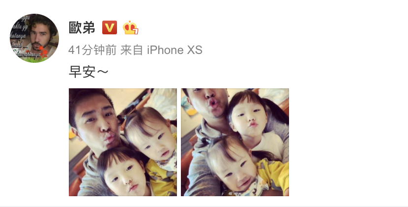 4月24日上午,欧弟在社交平台分享两张与女儿们的自拍合照,并配文:“早安~” 。照片中的欧弟怀抱着两个乖巧的女儿,小女儿眉眼间像极了爸爸,父女三人对镜嘟嘴卖萌,氛围幸福满满。