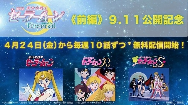 为了给剧场版《美少女战士 Eternal》前篇预热,从4月24日起,1992—1995年的三部动画《美少女战士》《美少女战士R》《美少女战士S》宣布再度回归荧幕免费播出与观众见面。三部《美少女战士》总共127话,每周播出10集,将持续至7月23日。