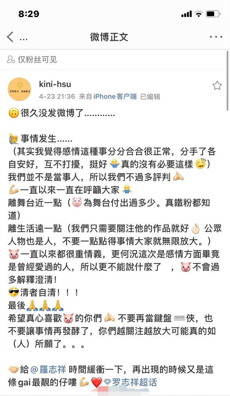 4月23日晚,罗志祥经纪人发文谈及罗志祥周扬青分手事件,被周扬青好友怒怼。罗志祥经纪人称称感情分分合合很正常,没必要这样,呼吁粉丝不要当键盘侠,不要让事情发酵,清者自清,给罗志祥时间缓冲。