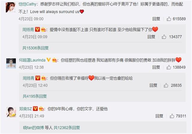 罗志祥人设崩塌,网友们既心疼周扬青浪费了9年青春在小猪身上不值得,又庆幸她能认清小猪真面目而重获新生,大家纷纷留言关心安慰周扬青。赌王之女何超莲、女神郑爽,以及曾经通过罗志祥和周扬青相识的女星恺恺都留言支持她。