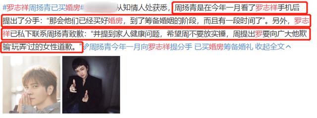 周扬青和罗志祥爱情长跑9年,一度到了谈婚论嫁的地步,却突然结束恋情令人嘘唏!据知情人透露,女方在今年1月份发现暗藏在小猪手机中的秘密后提出了分手,而那会儿他们已经买好了婚房,到了筹备婚姻的阶段,而且有一段时间了。