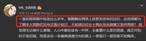 不过,小霜的发文很快被周扬青闺蜜怒怼:“一直和周周暗中较劲这么多年,暗戳戳在网络上故意发些有的没的,这些周都为了顾全大局隐忍没有正面计较过。”没多久,小霜删除动态。据悉,此前罗志祥经纪人小霜,被发现疑似在社媒和周扬青“争风吃醋”,有网友怀疑她和小猪是否也有非一般的关系?