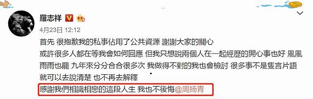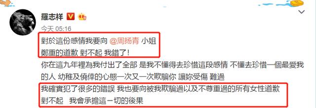 罗志祥的经纪人发文为自家艺人说话引网友不满,但当事人小猪却态度良好,在网上发文承认错误,还向周扬青以及那些被自己欺骗的女性表示道歉,称会承担一切的后果。不过这份道歉相对于他所做的事情来说,并无法得到大家的原谅,想来出道25年的罗志祥演艺事业应是走到尽头了。