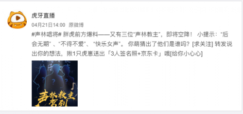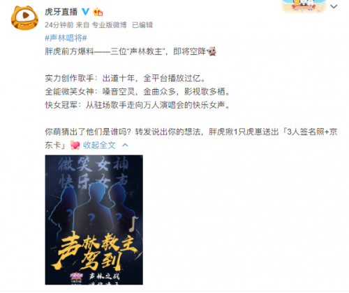 4月21日虎牙官博曾发布过声林唱将相关微博,提及“《不得不爱》”、“QQ音乐三巨头”等词,但随后又对内容进行了编辑。按照关键词对应,这三位“声林教主”极有可能是潘玮柏、尚雯婕、汪苏泷!这三位基本上都是国内音乐重量级大咖,经常活跃于屏幕前被大众所熟悉。看来虎牙《声林唱将》节目组是真的为这档大型音乐选秀下足了血本,势要将节目打造成直播平台最高水准的音乐竞技秀!