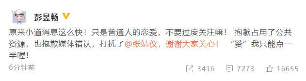 彭昱畅这家伙超级实诚,很快就发文承认新恋情,不过他否认女朋友是张婧仪,称”只是普通人的恋爱“,还恳请求大家”不要过度关注“,至于他说”赞”只能点一半,皆因此前他曾在节目中表示,如果自己的恋情被拍到了,就假装手滑点个赞。