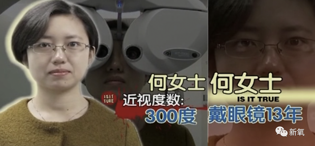 说!何女士近视度数为300度,戴了13年眼镜,眼轴距为25mm;