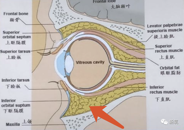 话说眼窝内部主要由4块内壁(上壁、下壁、内侧壁、外侧壁)形成一个漏斗状的空间,内部填充着脂肪;