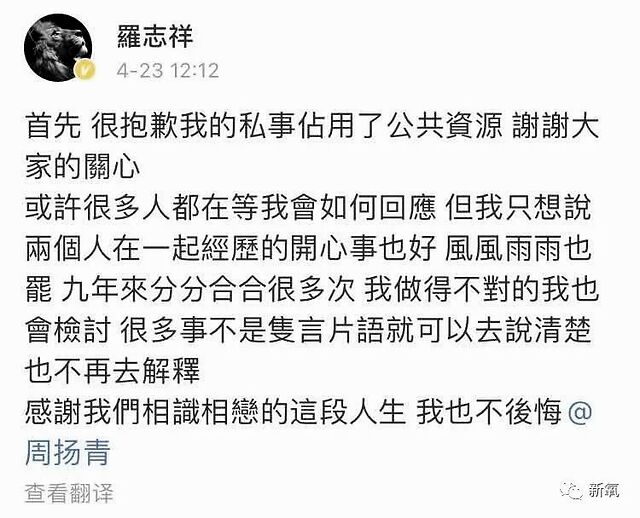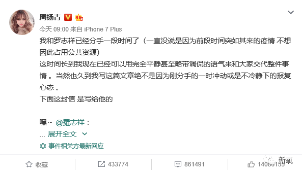 瓜田丰收的一天,周扬青发了长微博阐述了自己已经分手的事实,并且条理清晰地说明了分手原因。