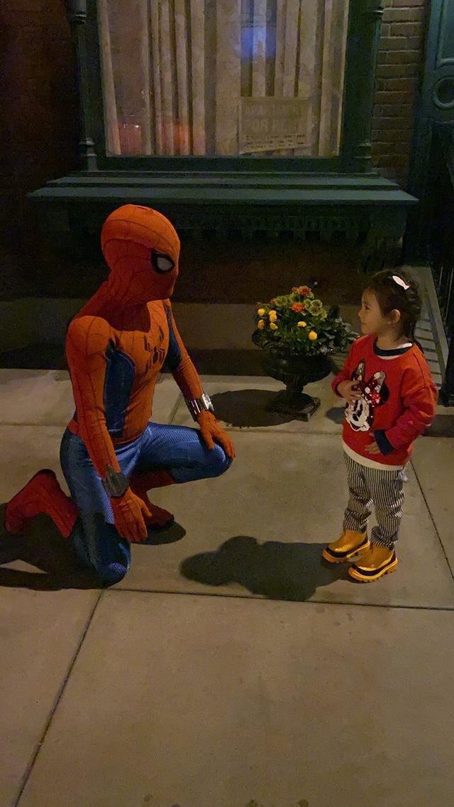 蜘蛛侠扮相的陈冠希面对着女儿Alaia单膝跪地,Alaia则面对着陈冠希站立,穿着红色米妮的上衣,条纹裤子,和一双黄黑色的靴子,可爱的模样让人十分喜爱,陈冠希真的把女儿宠成了小公主。