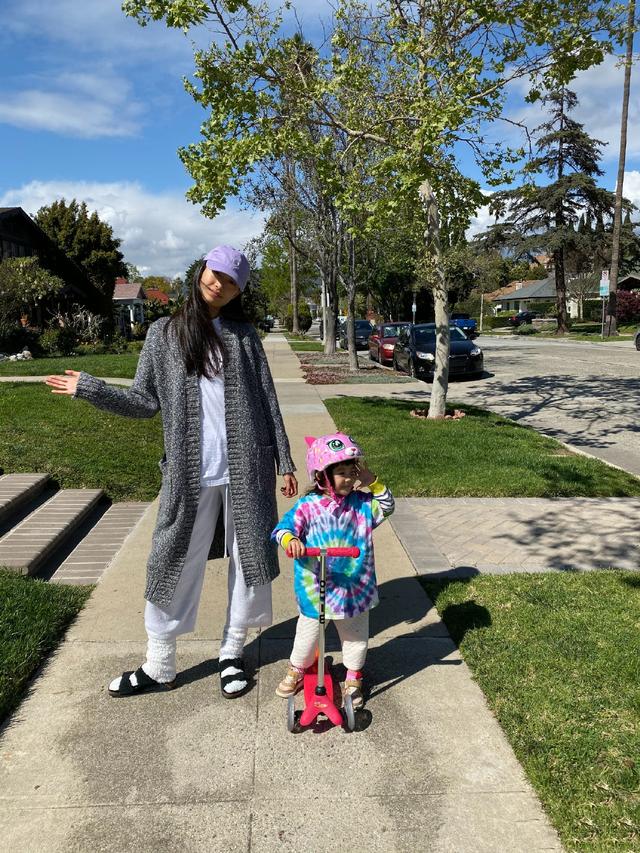 三岁的Alaia头戴粉红色头盔,蓝色的上衣和白色的裤子,站在红色的儿童滑板车旁,一只手搭在把上,另一只手敬礼,笑容灿烂,旁边是妈妈秦舒培,一身白色的衣服搭配紫色帽子,灰色大衣和黑色的鞋,简约大气,阳光正好,适合游玩。