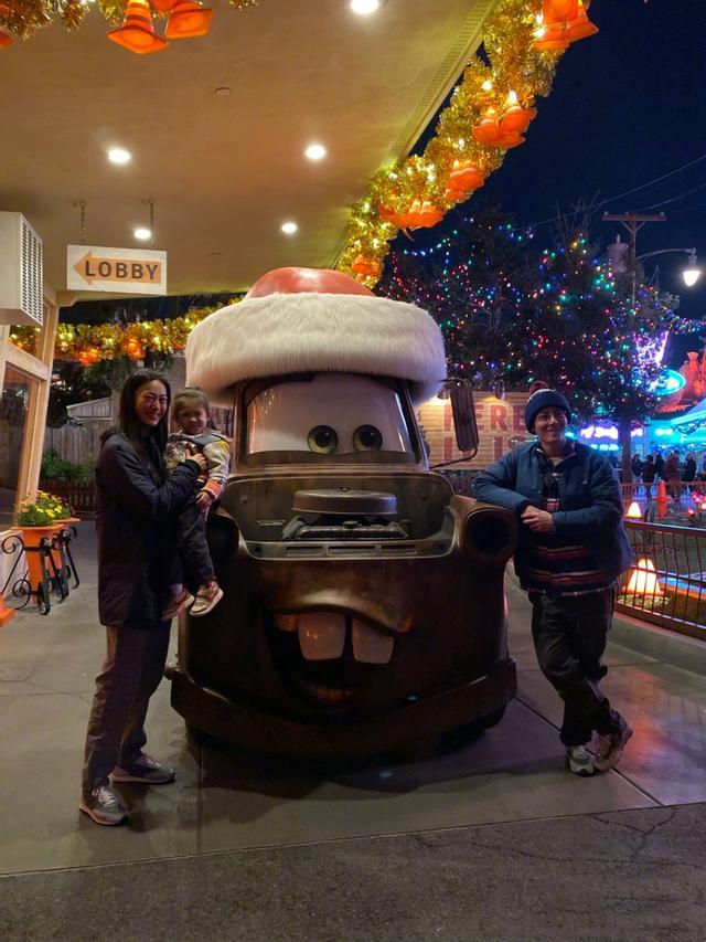 秦舒培一家三口现在一个人物化的黑色车车旁边,秦舒培抱着女儿,三个人都十分开心,笑容灿烂,十分甜蜜。