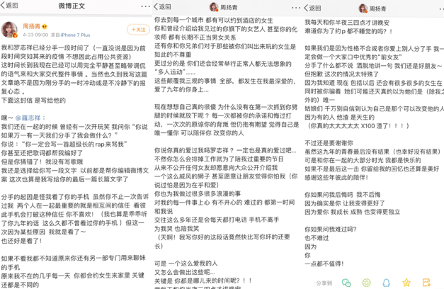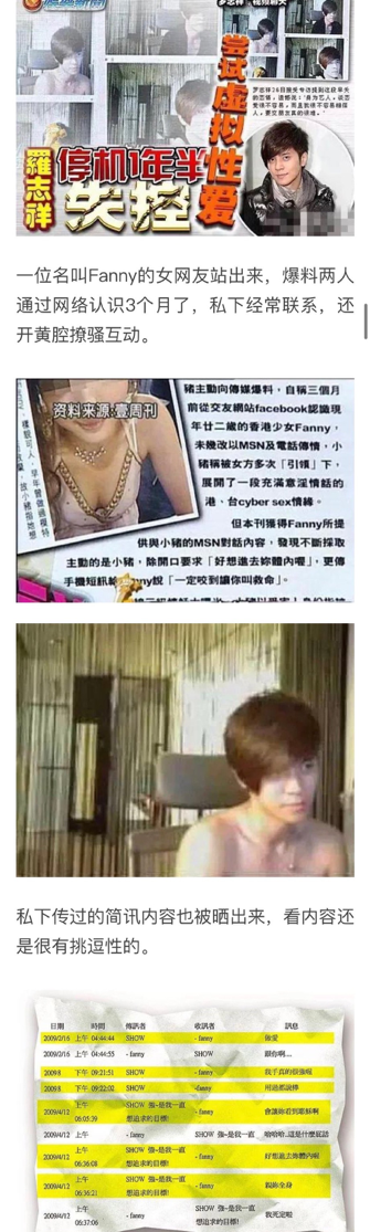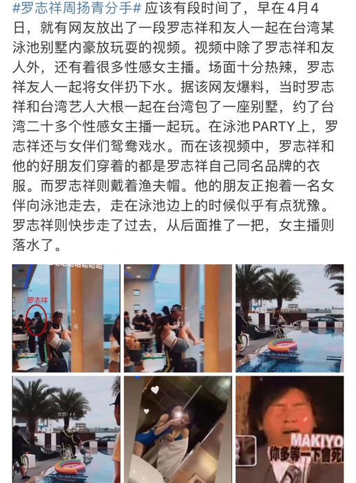 戳右边关注我,全面掌握圈中八卦! 今早9点,罗志祥前女友周扬青承认与罗志祥分手,结束9年恋爱长跑。 洋洋洒洒一大段,看似云淡风轻还略带戏虐,实则是重锤出击,揭露了罗志祥恋爱九年以来的各种风流韵事。 1.罗志祥有两个手机,一部用来和周扬青联系,另一部专门用来撩妹; 2.周扬青没在罗志祥身边的每一天,罗志祥都会约不同的女生到家里; 3.罗志祥每去到一个城市,都会约不同的女生到酒店; 4.罗志祥和旗下的女艺人、化妆师都有长期不正当男女关系; 5.罗志祥和他的兄弟们十分不尊重女性; 6.罗志祥和兄弟们经常性举行正常人无法想象的“多人运动”; 7.周扬青和罗志祥异地时两人会联系到半夜3、4点,但就算这么晚罗志祥也有时间和其他女生约。 一条一条看下来,罗志祥的所做所为都颠覆了大众的三观,正当网友对他口诛笔伐,骂得激烈时,罗志祥本人出来做出了回应。 这篇声明看似什么都说了,但也没什么都没说透,可他的毫无底气和变相承认也在短短几行字中暴露无疑。 今天看到有人说罗志祥人设崩塌,但其实在我看来,罗志祥根本不存在崩塌人设这回事,因为他一直都是这样的人,只是这几年大陆的综艺节目上太多,节目给他赋予了太多光环,所以才让大众忘记了他的恶心事。 欧弟服兵役时抢走欧弟女友 欧弟当时和罗志祥是铁哥们儿,两人还有一个组合叫“罗密欧”。欧弟当时去服兵役就拜托罗志祥照顾他的女友Makiyo,结果没过几个月,罗志祥就和Makiyo在一起了。虽然后来Makiyo有解释说和欧弟分手是因为欧弟偷腥,但这也改变不了她和欧弟好兄弟在一起的事实。 裸聊事件 这件事对于罗志祥的职业生涯来说是不小的冲击。一个名叫Fanny的女网友爆料她和罗志祥在网上认识三个月,私下经常联系,讯息内容充满了性暗示和挑逗,甚至在两人开视频的过程中,罗志祥还情不自禁的脱掉了自己的衣服。 演唱会关于妈妈的不堪言论 罗志祥和他妈妈关系很好,亲密的程度到了经常嘴对嘴亲亲的程度。 媒体也爱拿他和妈妈的关系出来炒作,可他自己也不亦乐乎。 有一场演唱会罗志祥表演了30秒的电臀舞(顶胯舞),结束之后他还说:“我妈妈受不了了,我妈妈真的受不了,我妈妈说你老爸有你今天的一半就好了!那我就要生两个!” 这是什么母子关系我不做轻易揣测,但是为了热度挑战伦理底线,实属不该。 疫情期间包别墅开泳池party 在网友曝光的视频中,罗志祥的朋友抱着一个身材火辣的女生走在前面,罗志祥紧跟其后,两人合力把女生扔进了游泳池,周围还有一票人跟着起哄。 据知情人士透露,当天是罗志祥包场了一栋别墅,请来了20位性感女主播一起共同快乐。这大概就是周扬青提到的“多人运动”吧…… 和旗下艺人暧昧不清多年 罗志祥旗下有名艺人叫简恺乐,以前是儿童频道的主持人,艺名蝴蝶姐姐。后来因为年纪大了不再适合儿童节目,所以就转型当了性感艺人。 为了帮她转型,罗志祥开了一家公司,自掏腰包带她去拍写真;简恺乐除了新歌,MV里都是罗志祥收藏的名牌鞋,而且每年她生日罗志祥都会送她一个奢侈品包包。 但每次有人问到简恺乐和罗志祥是什么关系时,简恺乐都说是兄妹,就这样的付出和关系,亲兄妹也不过如此吧。 吃完了罗志祥这些瓜,真的想说一句,罗志祥是恶心他妈给恶心开门,恶心到了家!