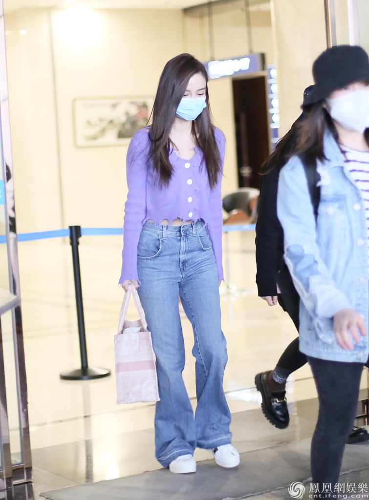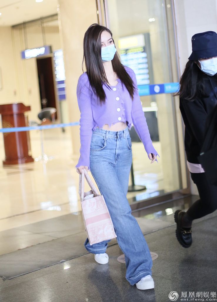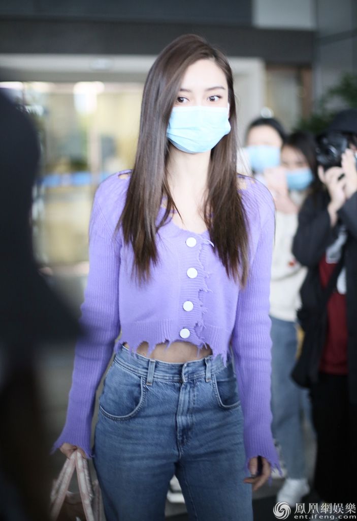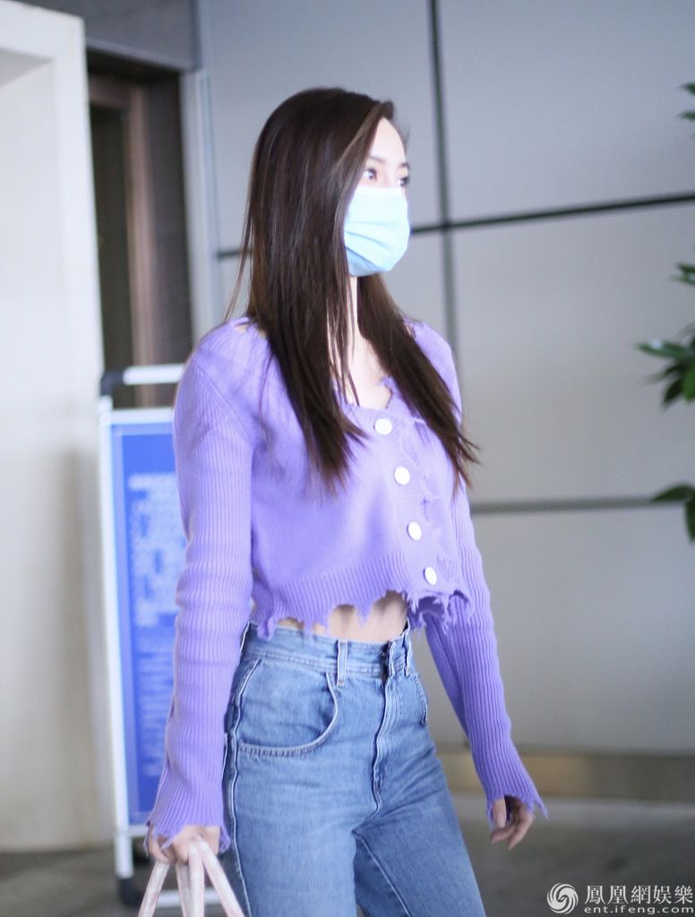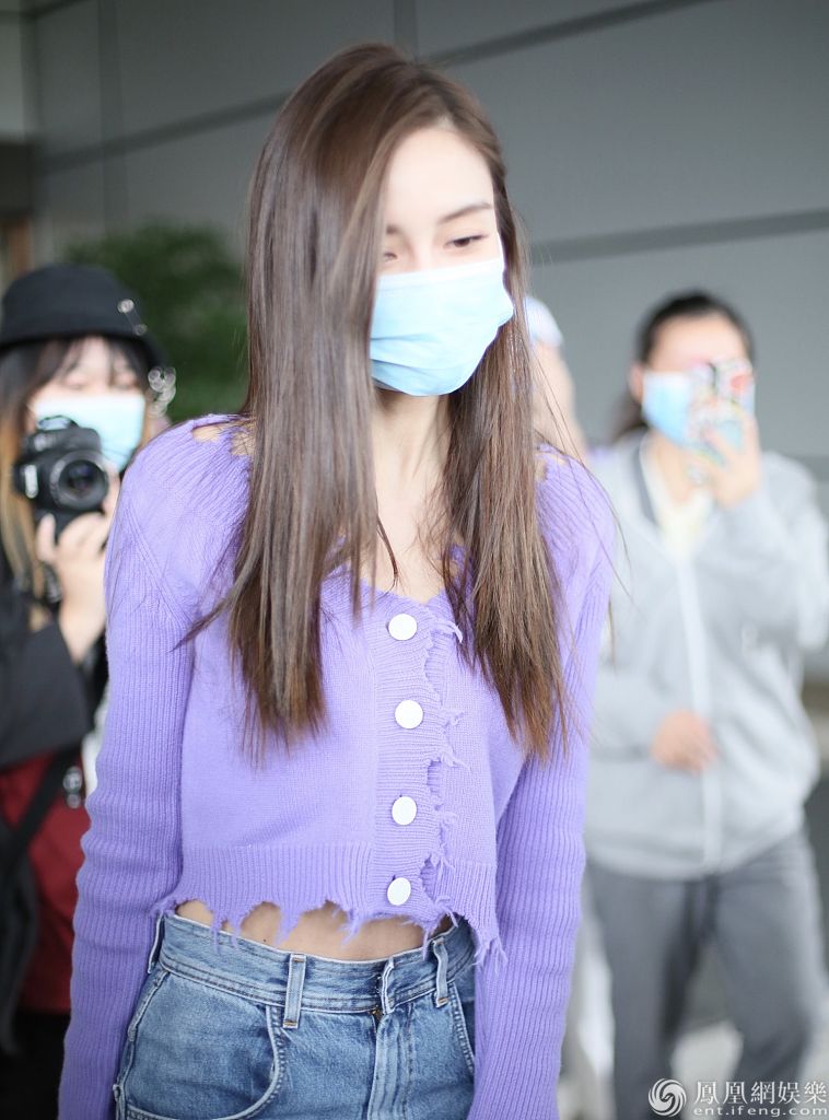 2020年4月23日,长沙,Angelababy现身机场。长发披肩的她身着紫色超短上衣,大秀性感蛮腰,好身材一览无遗,果然是辣
