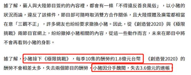 罗志祥因此也损失惨重,根据了解,小猪接下的《极限挑战》每季十集的片酬是1.8亿台币(约四千万人民币)再加上隔壁的《创造营2020》,这次小猪因为分手丑闻将失去3.6亿台币的进账(约八千多万人民币)可见这次丑闻对于小猪的事业是个沉痛的打击了!