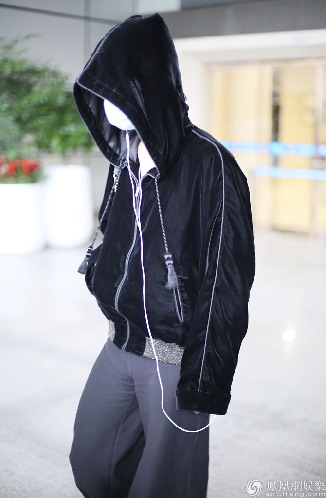 周震南口罩遮面,戴起帽子,一路低头听音乐。
