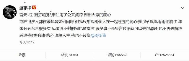 事后罗志祥也发文回应,只说“不后悔”却不否认渣男行为,还承认自己有不对的地方,疑似间接承认周扬青爆料属实,让粉丝们大失所望。