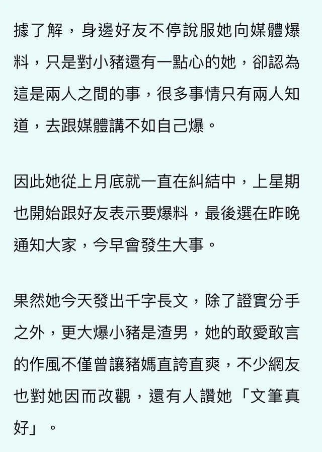 有台湾媒体爆料,指周扬青为发表长文公开罗志祥劈腿已经纠结了有一段时