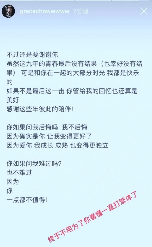 她也表示以后不用迁就罗志祥写繁体,一身轻松。