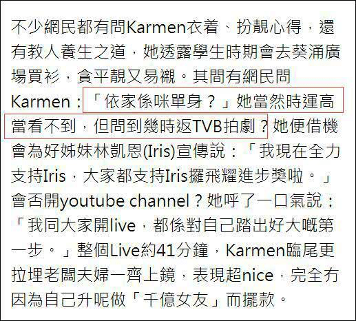 林凯恩在TVB摸爬滚打了几年,还远远够不上一线花旦的位置,在感情方面,除了TVB艺人阮政峰传过绯闻后,也没有新恋情传出。据港媒报道,虽然林凯恩事业心重喜欢演戏,但眼见闺蜜郭嘉文这么幸福,便心生羡慕想找个男人依靠。