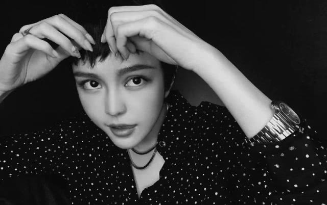 周扬青剪掉了以前的标志性甜美长发,以一张黑色背景的、利落短发女孩形象示人。